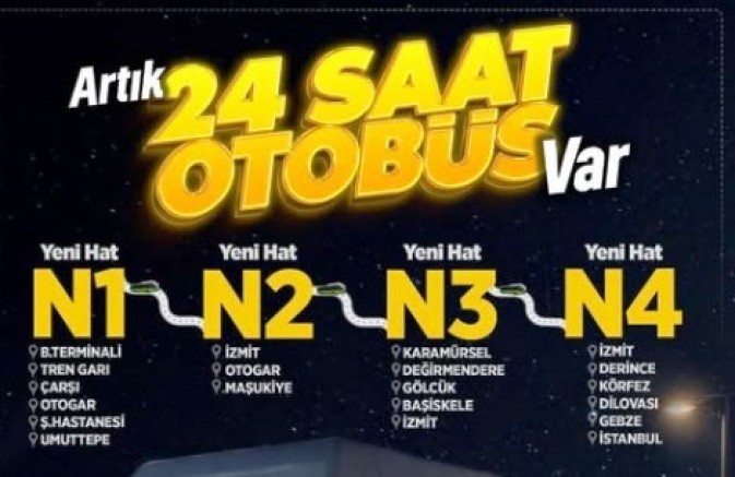 Büyükakın, 'Yarından itibaren 4 yeni gece hattıyla; Gebze’den İzmit’e, Karamürsel’den Maşukiye’ye, Şehir Hastanesi’nden Umuttepe’ye kadar Kocaeli’nin dört bir yanında ulaşımı sürekli hale getiriyoruz. dedi