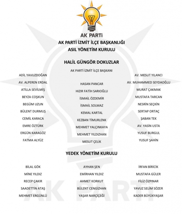 AK Parti İzmit İlçe Başkanı Halil Dokuzlar, Yeni yönetim lsitesini açıklarken Genel Başkanımız, Cumhurbaşkanımız Sn. Recep Tayyip Erdoğan'ın tensipleriyle; AK Parti Kocaeli İl Başkanımız Sn. Dr. Şahin Talus'un olurlarıyla AK Parti İzmit İlçe Başkanlığı Yönetim Kurulumuz atanmıştır hayırlı olsun...Cumhurbaşkanımız ve Genel Başkanımız Sn. Recep Tayyip Erdoğan'ın liderliğinde hedeflerimize emin ve güçlü adımlarla yürüyeceğiz... payaşımını yaptı.