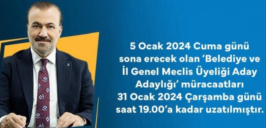 AK Parti’de 7 Kasım’da başlayan ve 5 Ocak’a kadar uzatılan belediye meclis üyeliği aday adaylığı başvuruları yarın sona eriyordu. Alınan yeni bir kararla başvuru süreci yeniden uzatıldı. Başvurular 31 Ocak gününe kadar yapılabilecek. AK Parti Kocaeli İl Başkanı Şahin Talus yaptığı açıklamada, 5 Ocak Cuma günü sona erecek olan belediye meclis üyeliği aday adaylığı başvurularının 31 Ocak saat 19.00’a kadar uzatıldığını açıkladı.