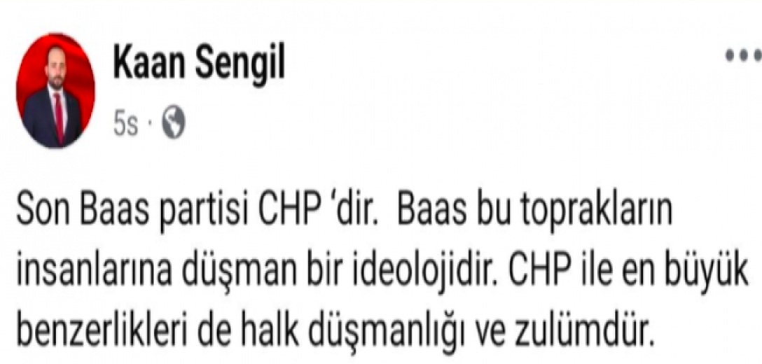 BBP-Büyük Birlik Partisi Kocaeli İl Başkanı Kaan Şengil ise sosyal medya hesabı üzerinden dikkat çeken bir paylaşımda bulundu. Cumhuriyet Halk Partisi'ni Baas Partisi'ne benzeten Şengil, “Son Baas Partisi CHP'dir. Baas, bu toprakların insanlarına düşman bir ideolojidir. CHP ile en büyük benzerlikleri de halk düşmanlığı ve zulümdür” ifadelerine yer verdi.
