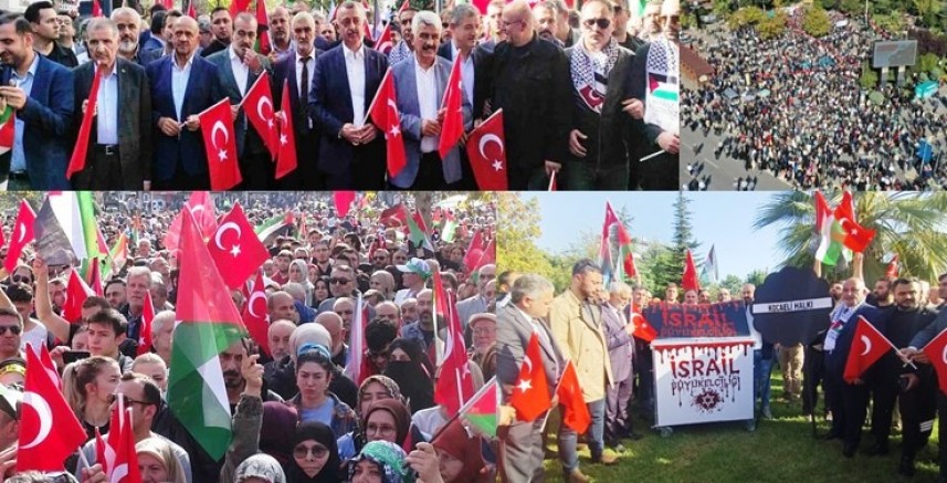 Kocaeli'de yaklaşık 5 bin kişi Filistin'e destek yürüyüşüne katılarak İsrail'i protesto etti. Sloganlar atan vatandaşlar, hayatını kaybeden Filistinliler için dualar etti. Kocaeli'de binlerce kişi Filistin'e destek vermek, İsrail'i protesto etmek için yürüdü. İzmit Yürüyüş Yolu'nda buluşan yaklaşık 5 bin kişi, "kahrolsun İsrail" sloganları attı. 250 sivil toplum kuruluşunun öncülüğünde düzenlenen yürüyüşe, Kocaeli Büyükşehir Belediye Başkanı Tahir Büyükakın, milletvekilleri, ilçe belediye başkanları ve siyasi parti temsilcileri de katıldı. Ellerindeki Türkiye ve Filistin bayraklarıyla yürüyen kalabalık, İsrail'i protesto etti. Programda hayatını kaybeden Filistinli vatandaşlar için de dua edildi. Miting düzenleme komitesinden Kocaeli Gönüllü Teşekküller Dönem sözcüsü Hanefi Akbulut'un okuduğu Basın Açıklaması şöyle: ' Filistinimiz, Etrafı bereketli kılınan Mescidi Aksamız, İlk kıblemiz… Uzun bacaklı İngilizlerin çizmeleriyle kirlendiği günden beri topraklarımız kan ağlıyor. Bugün, insanlık tarihinde eşine nadir rastlanan bir vahşeti kınamak ve insanlığa haykırmak için burada bulunuyoruz. İsrail, bu zamana kadar masumların canına kıydığı gibi, 17 Ekim günü, savunmasız sivillerin, sağlık personellerinin, yaralı ve hastaların bulunduğu bir hastaneyi, bombaladı ve 500’den fazla insanı katletti, 2000’den fazla insanın yaralanmasına yol açtı. Ortadoğuda durmaksızın Müslüman kanı akıyor. Dün Irak ve Afganistan’ı kana boğan Haçlı ittifakı, bugün Libya ve Suriye’de yapacakları katliamlar için çıkara dayalı mutabakat masaları kuruyor. Dün Nazi zulmü bahanesiyle Filistin topraklarına gönderilen Siyonist teröröristler, bugün Nazileri aşan katliamlar yapıyorlar.