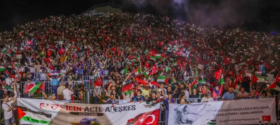 Kocaeli Büyük Filistin Eylemi kapsamında İzmit Endüstri Meslek Lisesi önünde, Sabri Yalım Parkında ve Fevziye Camii’nde toplanan gruplar Marina Kafe önünde birleşerek Sekapark Uçurtma Tepesi’ne yürüyüş gerçekleştirdi. Yürüyüşe katılan binlerce Kocaelili ellerindeki Filistin bayrakları ve marşlarla, Uçurtma Tepesi’ne doğru yola çıktı ve alana varıldığında eylem miting ile devam etti. Binlerce vatandaş Filistin için dua etti ve Kur-an okudu. Mitinge ve yürüyüşe Kocaeli Büyükşehir Belediye Başkanı Doç. Dr. Tahir Büyükakın da katılım sağlayarak destek verdi. Mitingde konuşan Kocaeli Gönüllü Kültür Teşekkülleri Başkanı Muhammet Hanefi Akbulut, “Tüm dünya bu katliama sessiz bir şekilde tepkisiz bir şekilde izin vermeye devam ediyor. Türkiye’de olduğu gibi dünyanın birçok yerinde bizim yaptığımız eylemlere benzer eylemler yapılıyor. Bizler biliyoruz belki bugün olmayacak ama bir gün muhakkak olacak. Ve şuna inanıyoruz ki Gazze’de direnen kardeşlerimiz Gazze’yi terk etmeyen kardeşlerimiz bu direnişlerinde bizim onların yanında olmamızdan büyük bir güç ve kuvvet alıyor. Bir günde iki evladını şehit veren, üç evladını şehit veren anne ve babalar, anne ve babalarını şehit veren çocuklar bizim bu dik duruşumuzdan güç alıyor. Soykırımcı İsrail her gün bu suçu işlemeye devam ediyor. Nehir’den denize özgür Filistin” şeklinde konuştu.