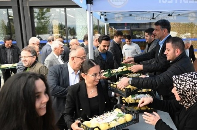 Kartepe Belediye Başkanı Mustafa Kocaman, Kocaeli Büyükşehir Belediyesinin kasım ayı olağan meclis toplantısı sonrasında üyelere Eşme ayvası dağıttı.